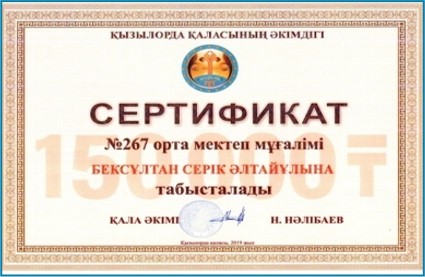 “Қызылорда қаласы әкімінің 150000 ТЕҢГЕ СЫЙАҚЫСЫ” иегері “Көркемдік эстетикалық балалар орталығының” ардагер ұстазы, “Атамұра ” ансамблінің жетекшісі Бексұлтан Серік Әлтайұлы (2019 жыл)